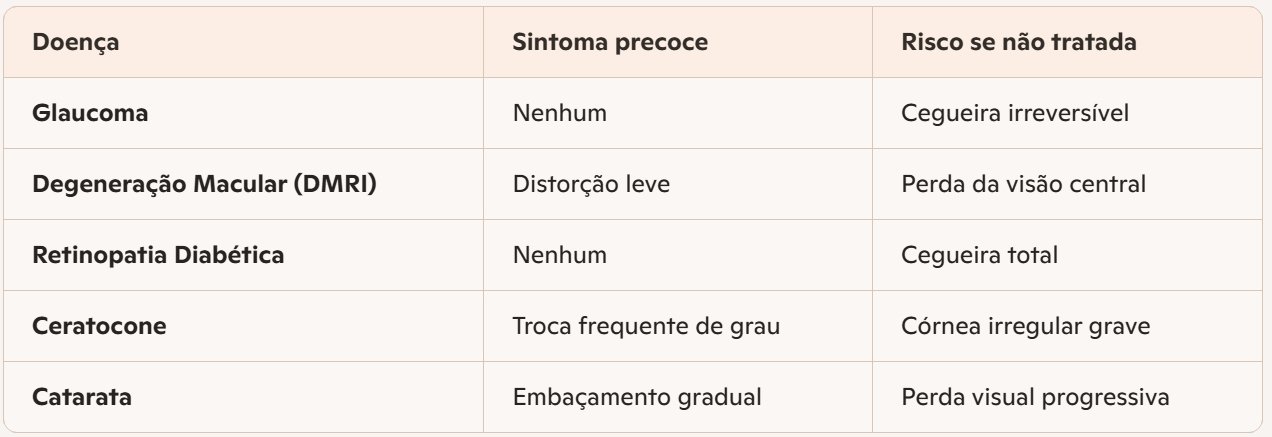 As doenças oculares mais graves são silenciosas. Quando os sintomas aparecem, muitas vezes o dano já está avançado.